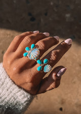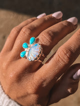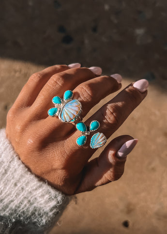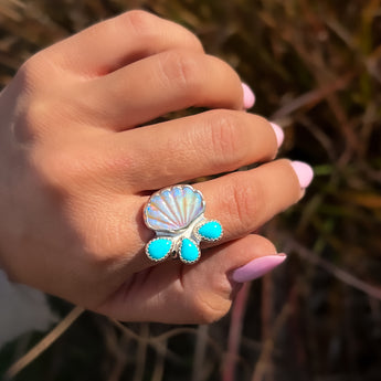 Hand carved opal shell gems paired with Kingman turquoise to complete the flow like the ocean!