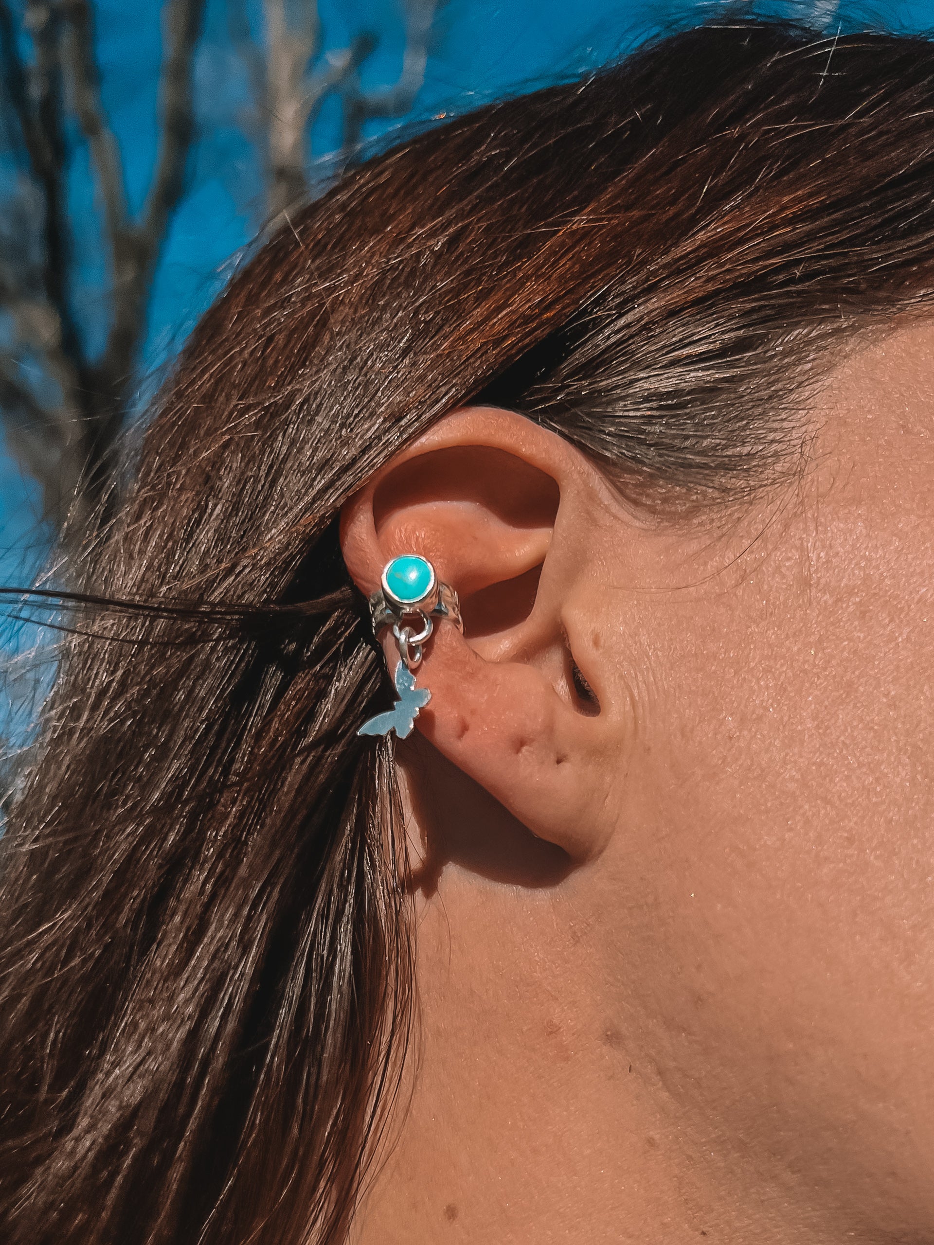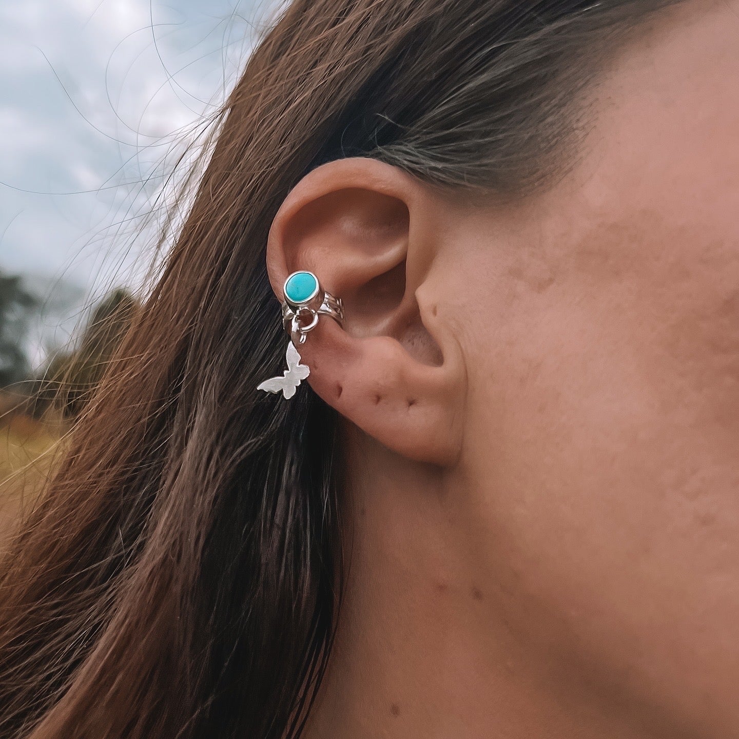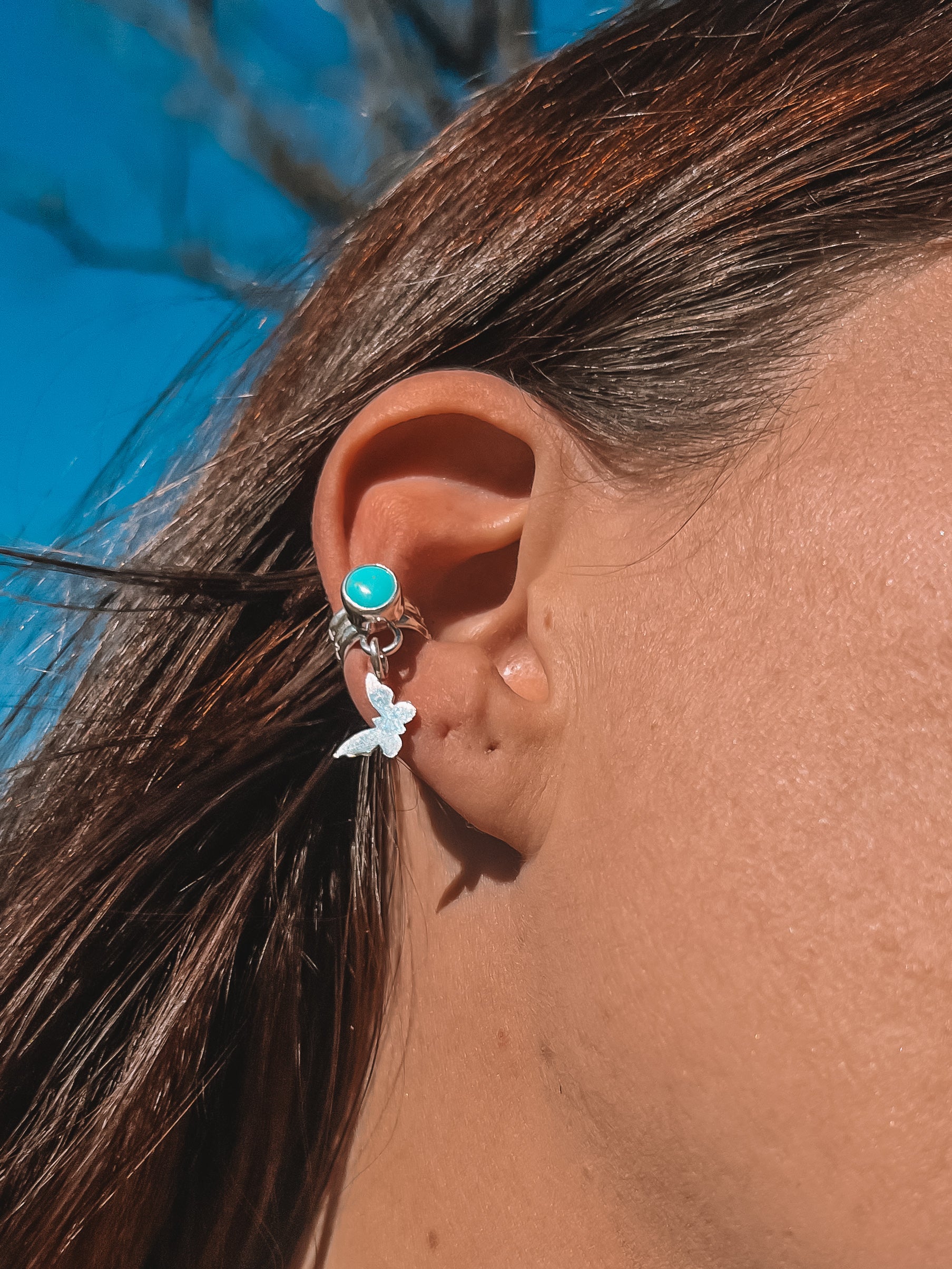 A Sonoran turquoise hug around the ear with a butterfly charm that compliments YOU!