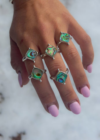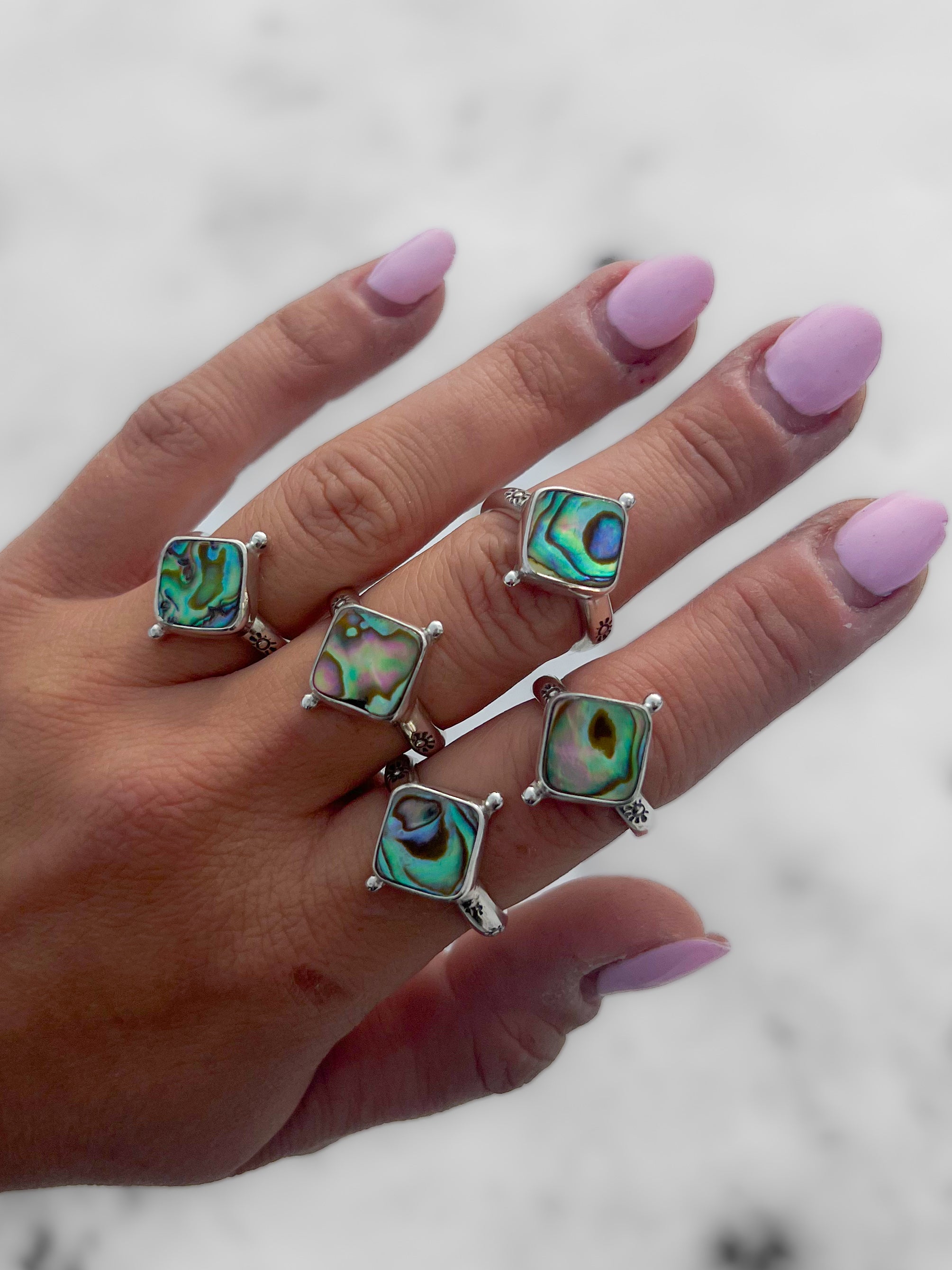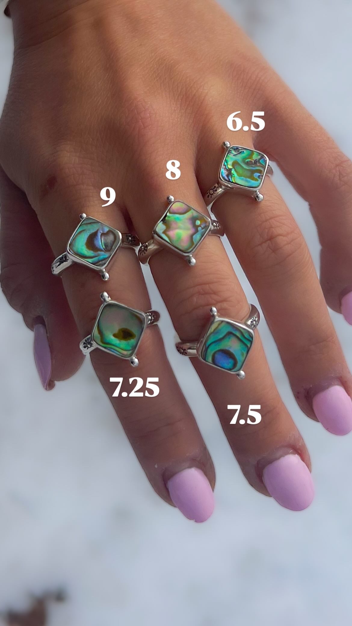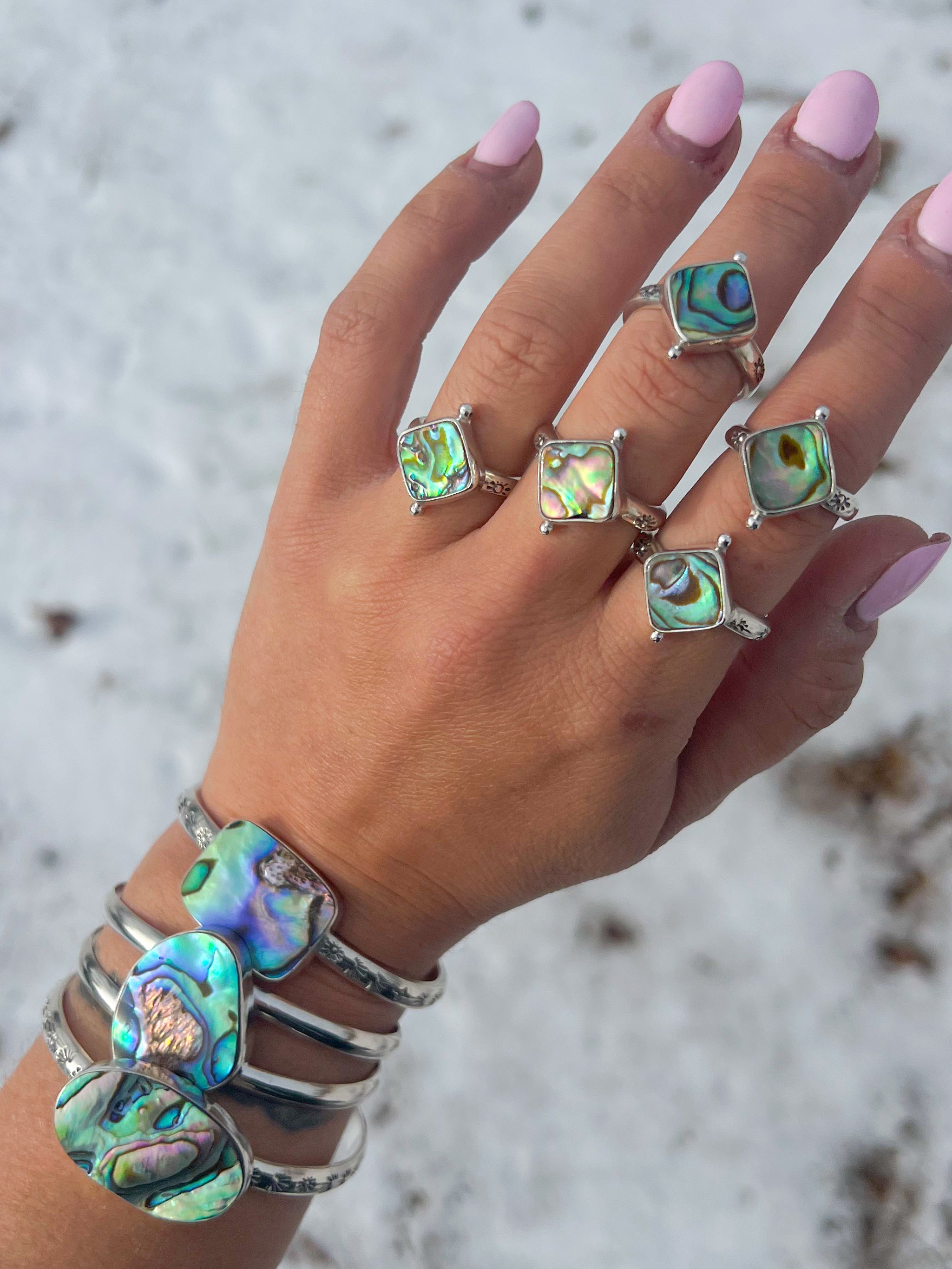 Each ring shows its own unique swirl of blues, greens, and shimmer, showing off its iridescent pop of color!!