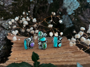 I am seeing a trend and I can’t help myself but add a little Spring right to your finger!! Three gorgeous Sonoran Gold Turquoise with two flower accent pieces and a hand stamped leaf to complete the piece! A showstopper, this beauty stops me in my tracks every time I look at her!