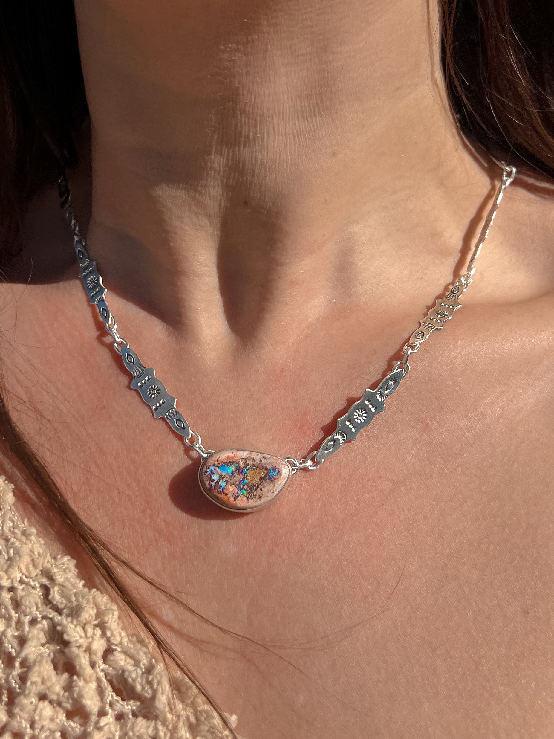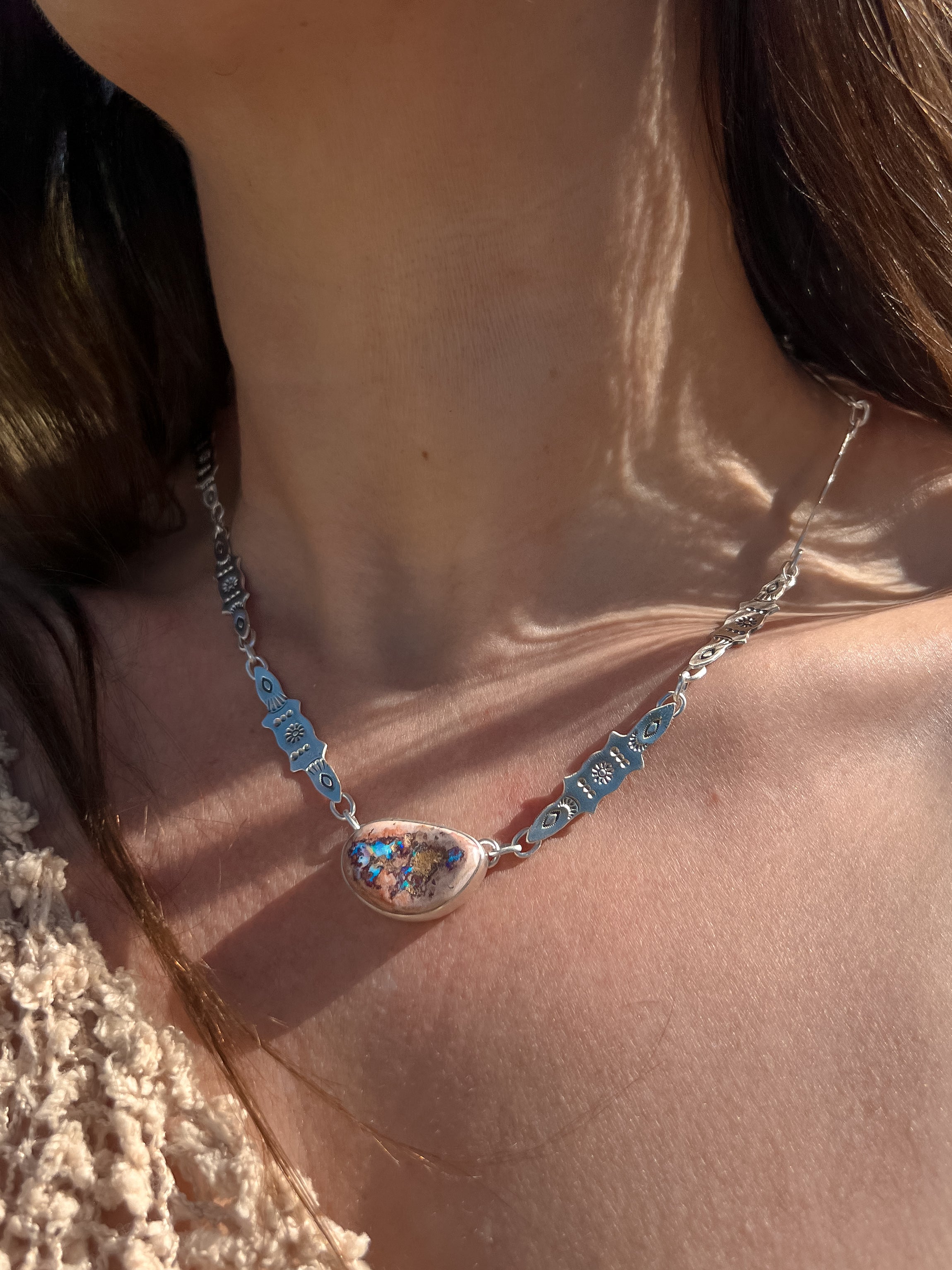 A melody in metal…hand drawn and forged necklace chain to compliment this stunning turquoise!