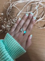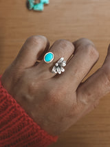 Hand forged half daisy and a Sonoran mountain turquoise effortlessly bring this open road ring style to life!! Style this stunner on its own or pair with your favorite stacking rings!!