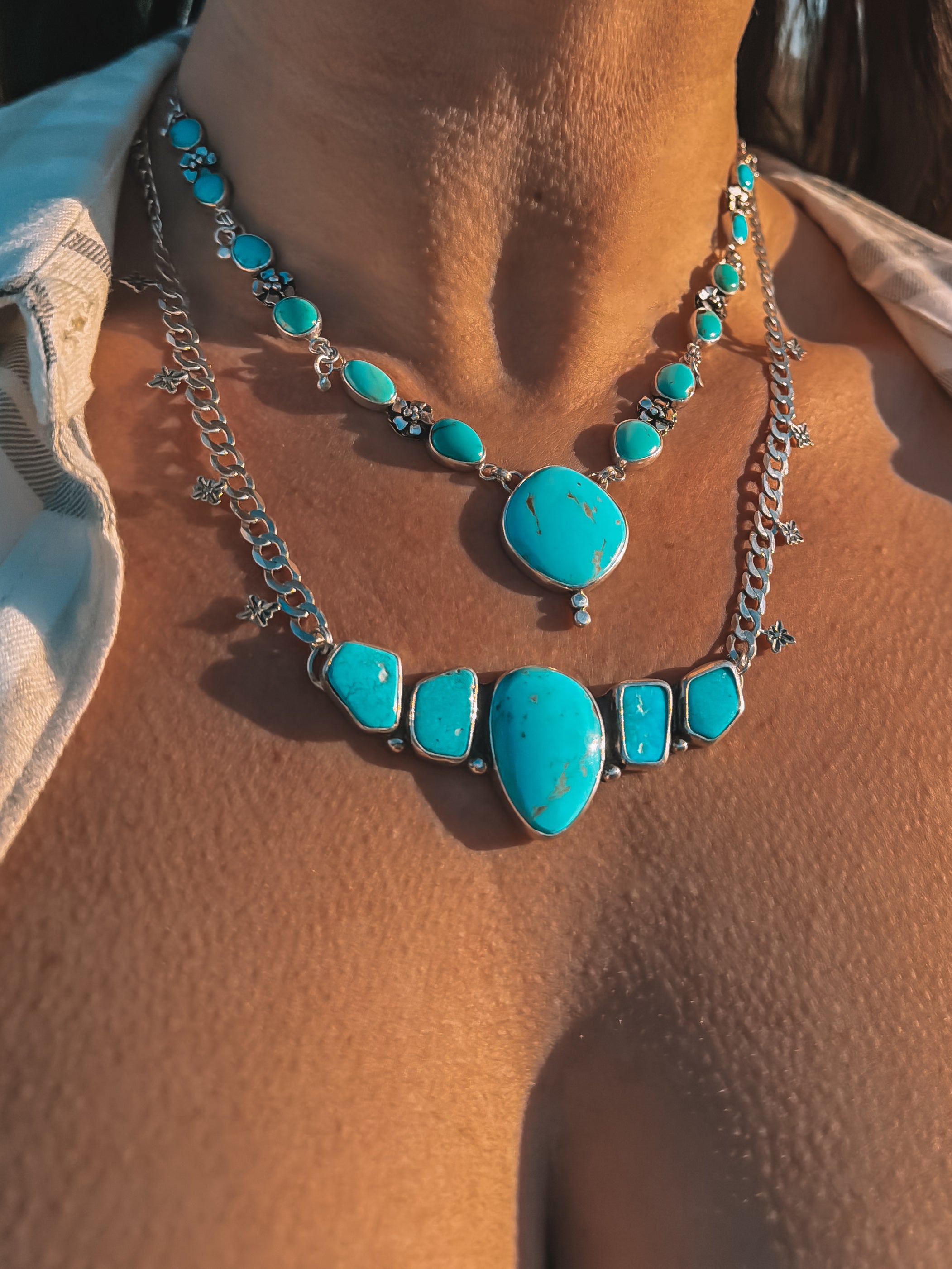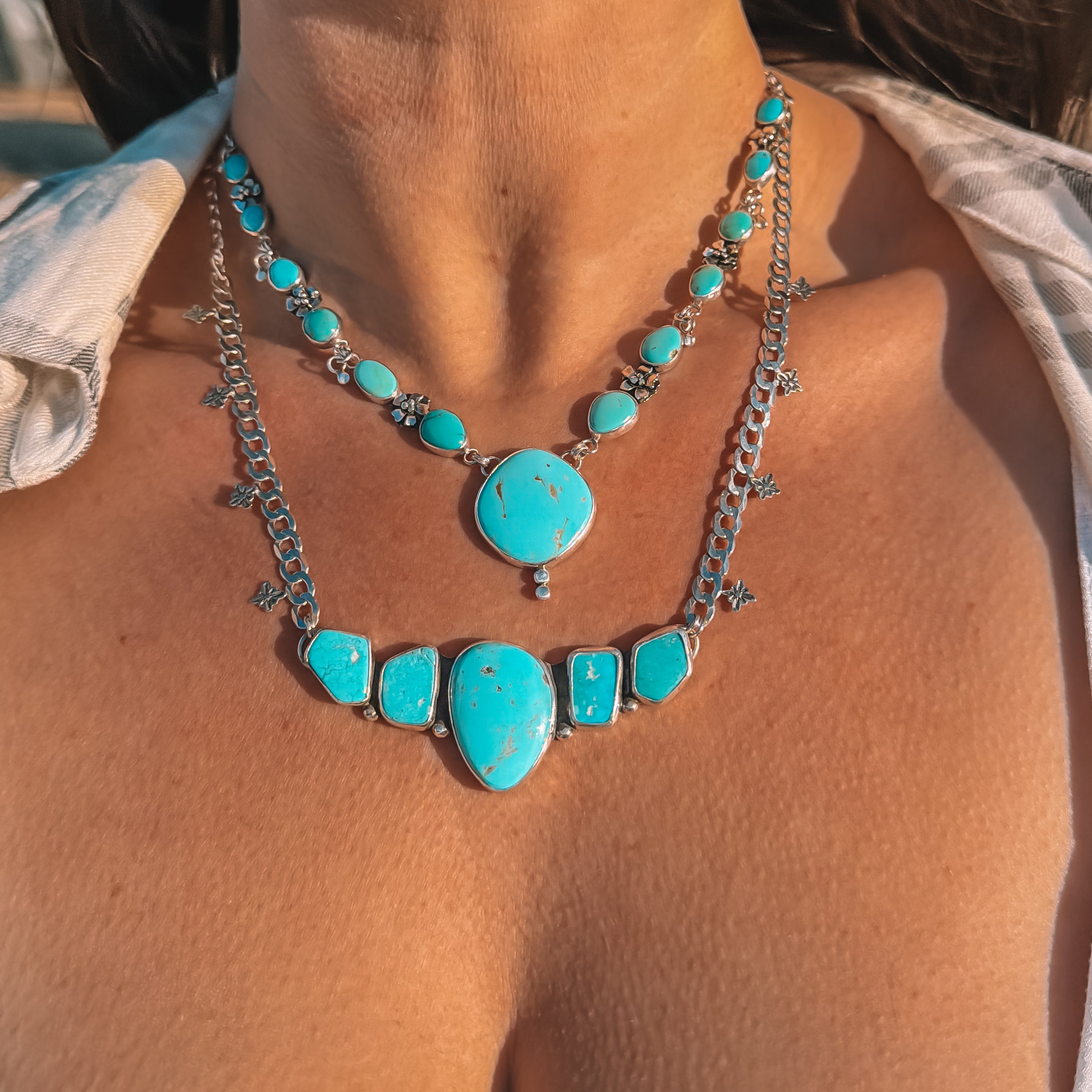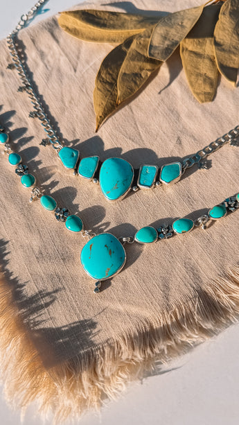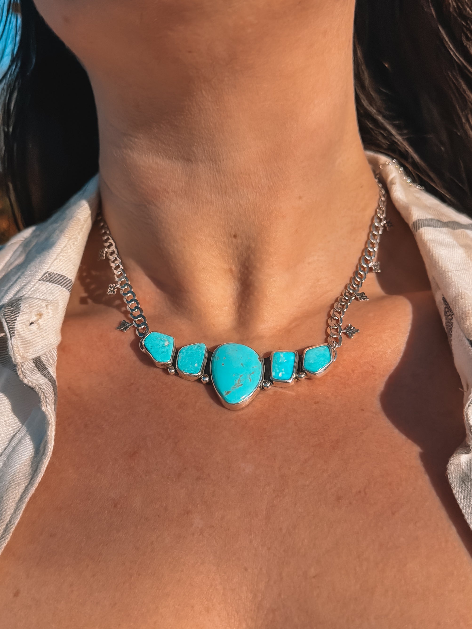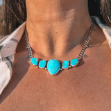 A trail of turquoise nuggets in between a thick curb chain with some star stamped accents to complete the piece!