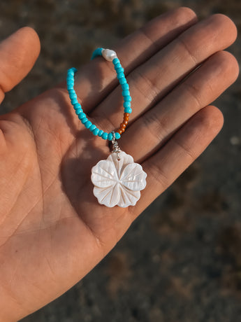 A flower carved from mother of pearl, nestled in-between blue seed beads and mother of pearl beads! Never letting go of summer!