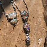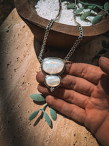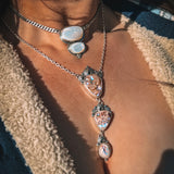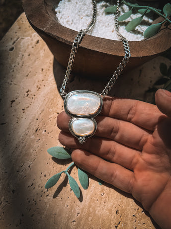 Hugs close and hits bold. Mother of Pearl that is show stopping, resting on a hand forged curb chain.
