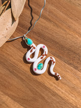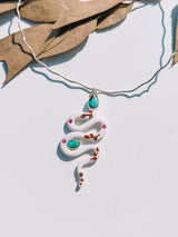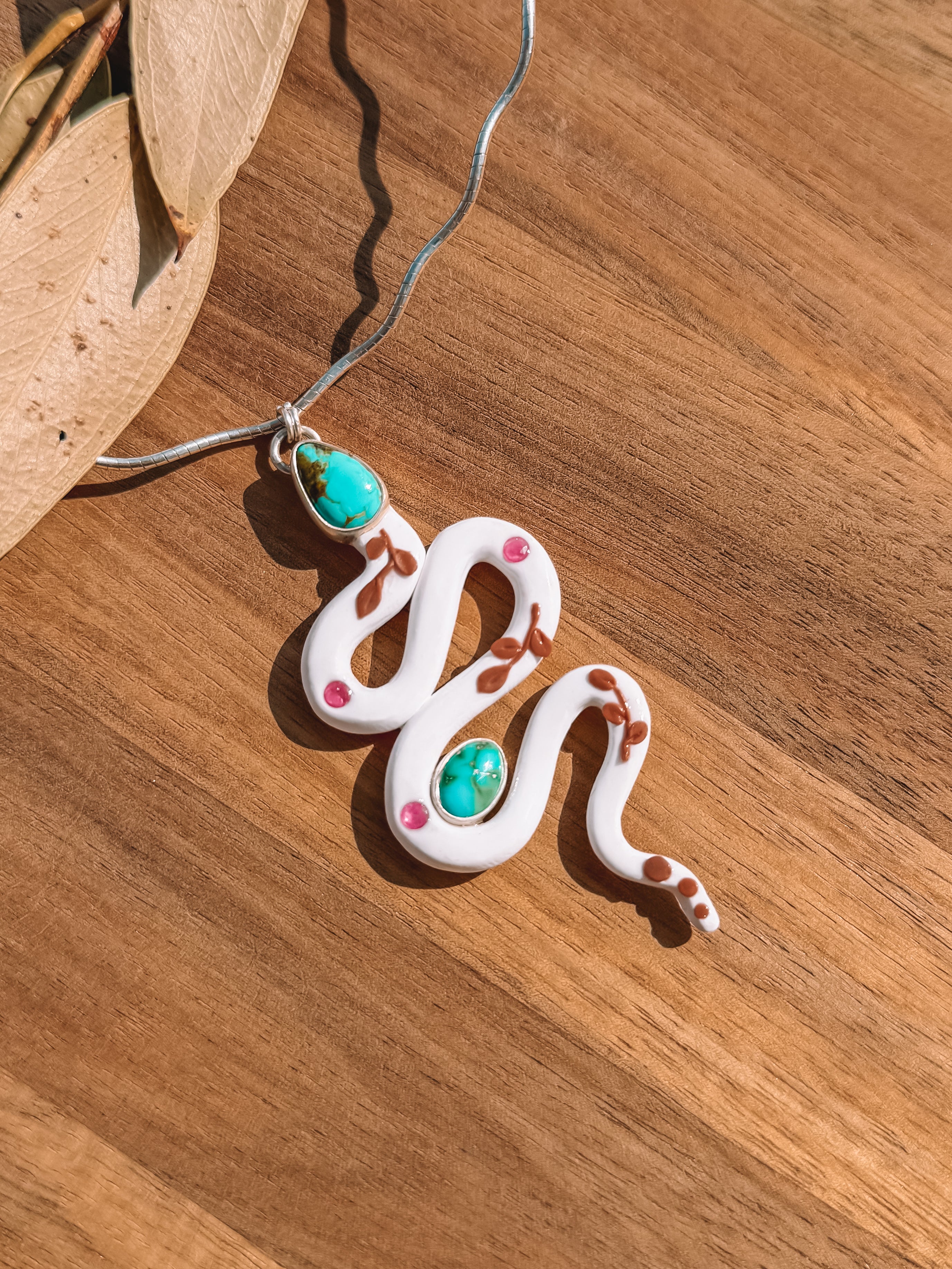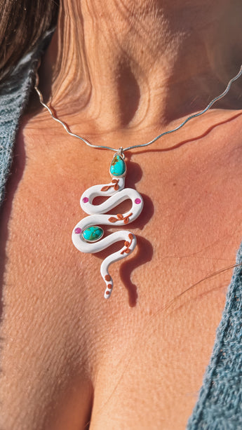 Desert spirit wrapped in white, pink, terracotta, blues, and greens! Rubies tucked like hidden treasures along her winding path. Meant to compliment you and YOUR story!